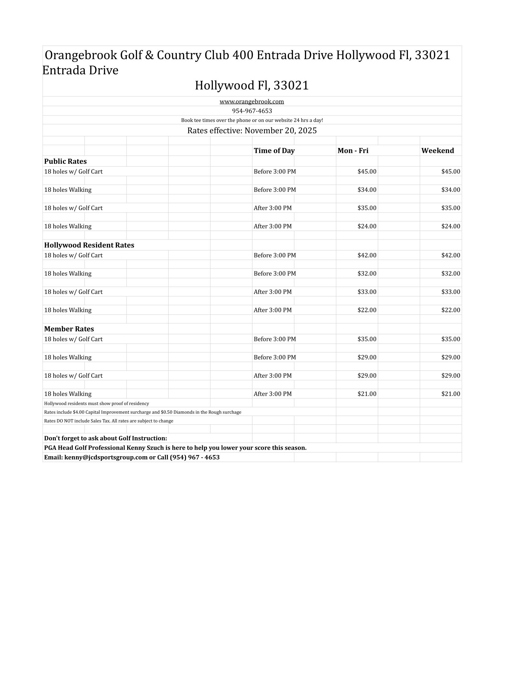 18 holes w/ Golf Cart Time of Day Before 3:00 PM Monday to Friday $42.00 Weekend $42.00